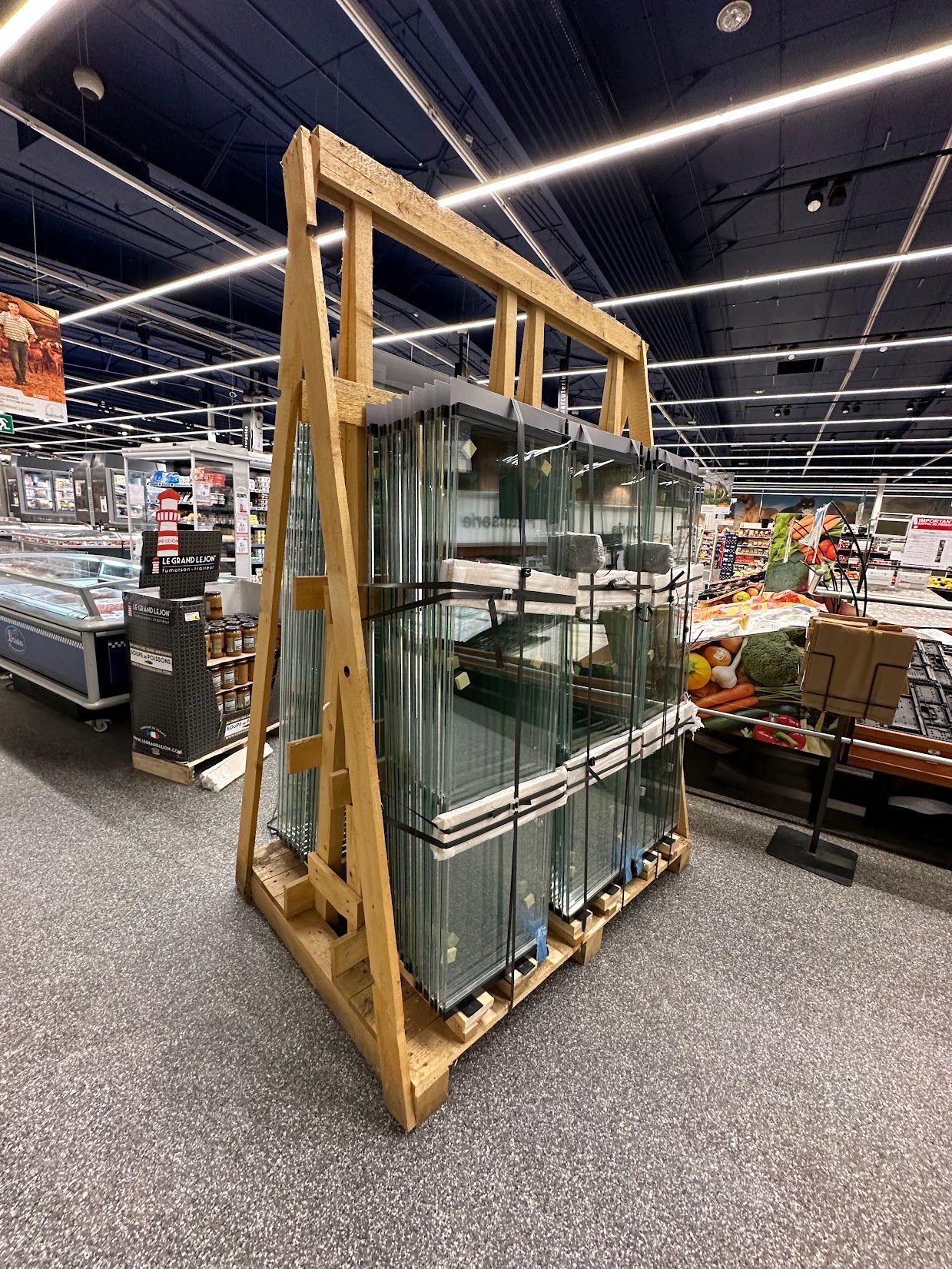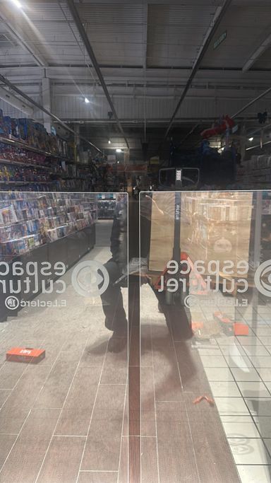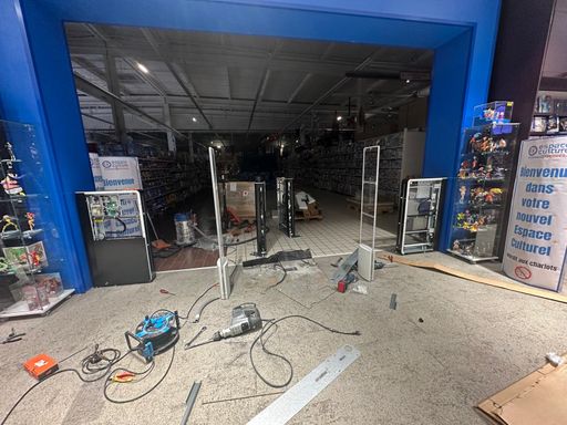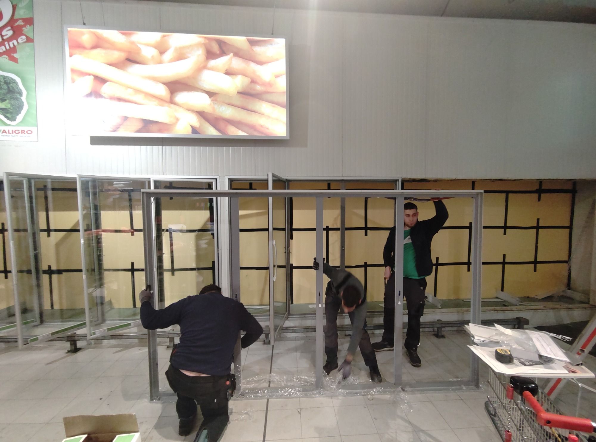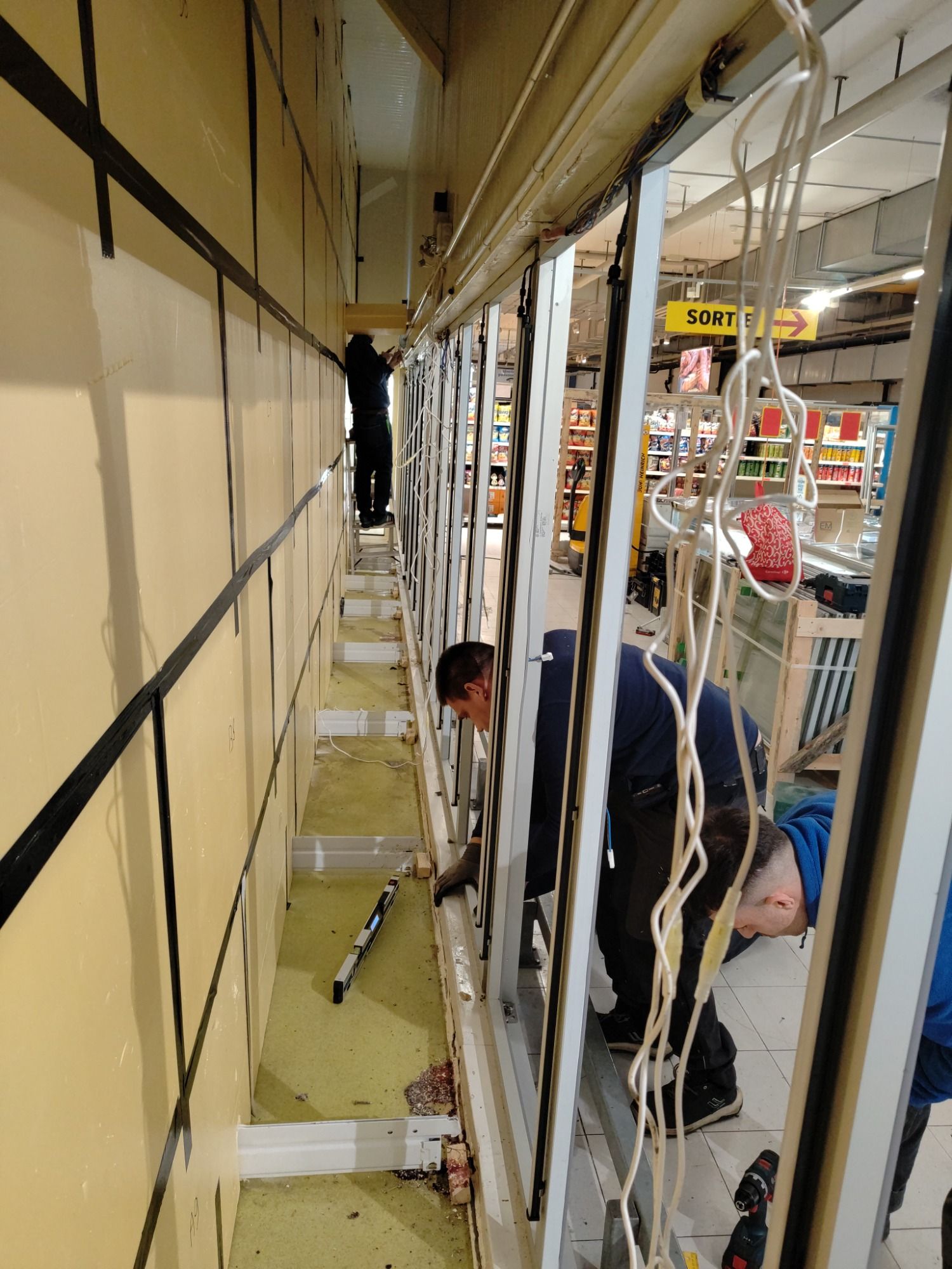 Installation de vitrines positives et négatives. Installation de portes pliantes pour gagner de l’espace pour chariots de grande surface.