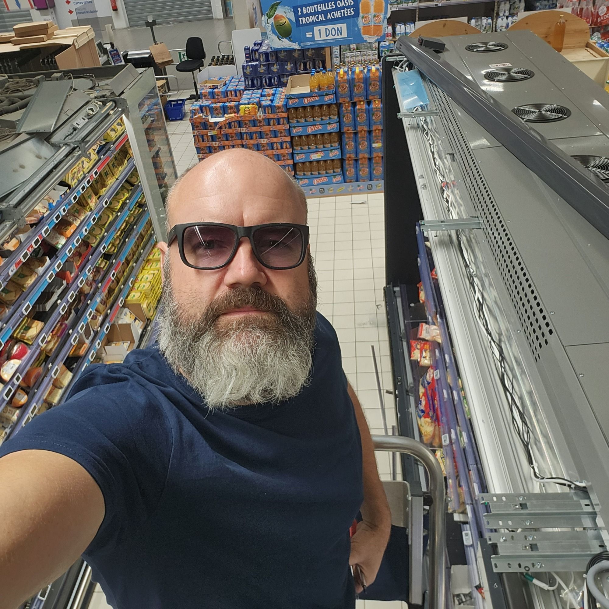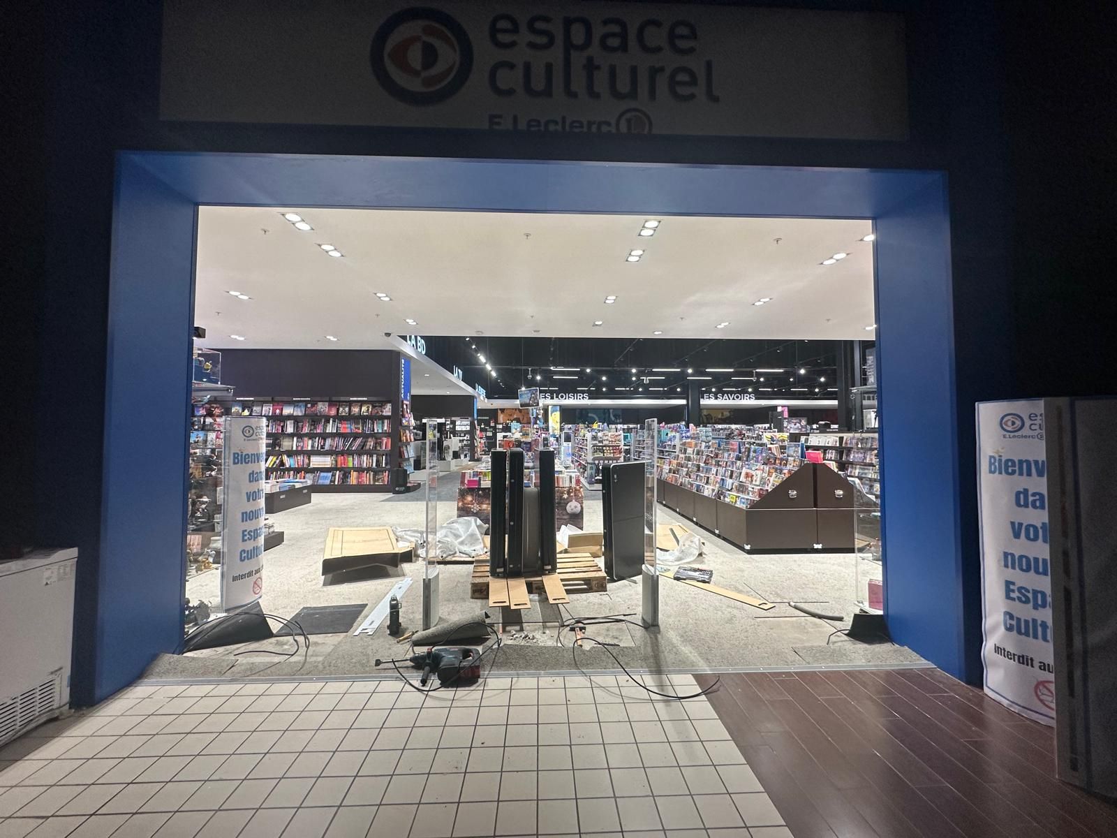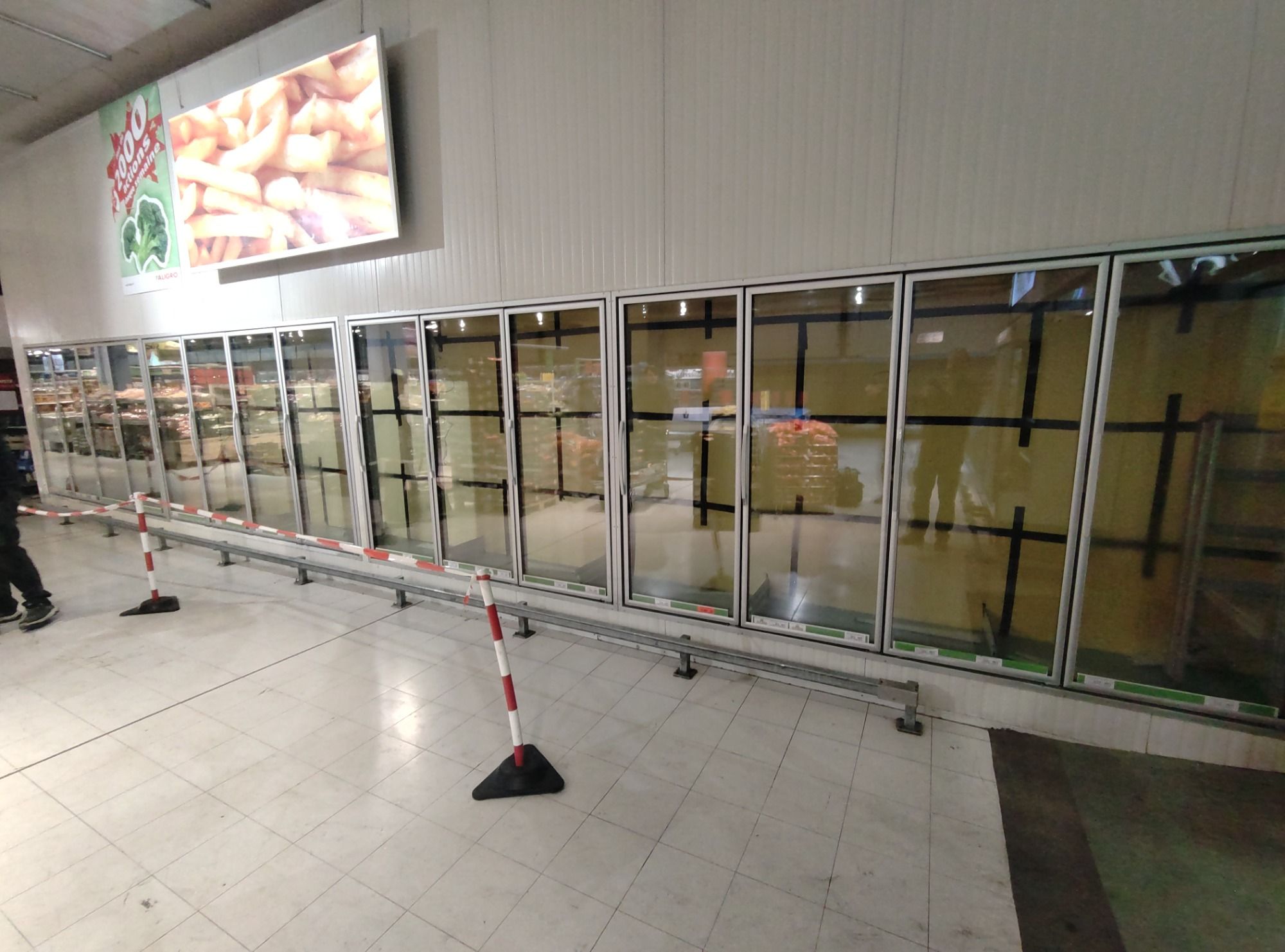 Installation de vitrines positives et négatives. Installation de portes pliantes pour gagner de l’espace pour chariots de grande surface.
