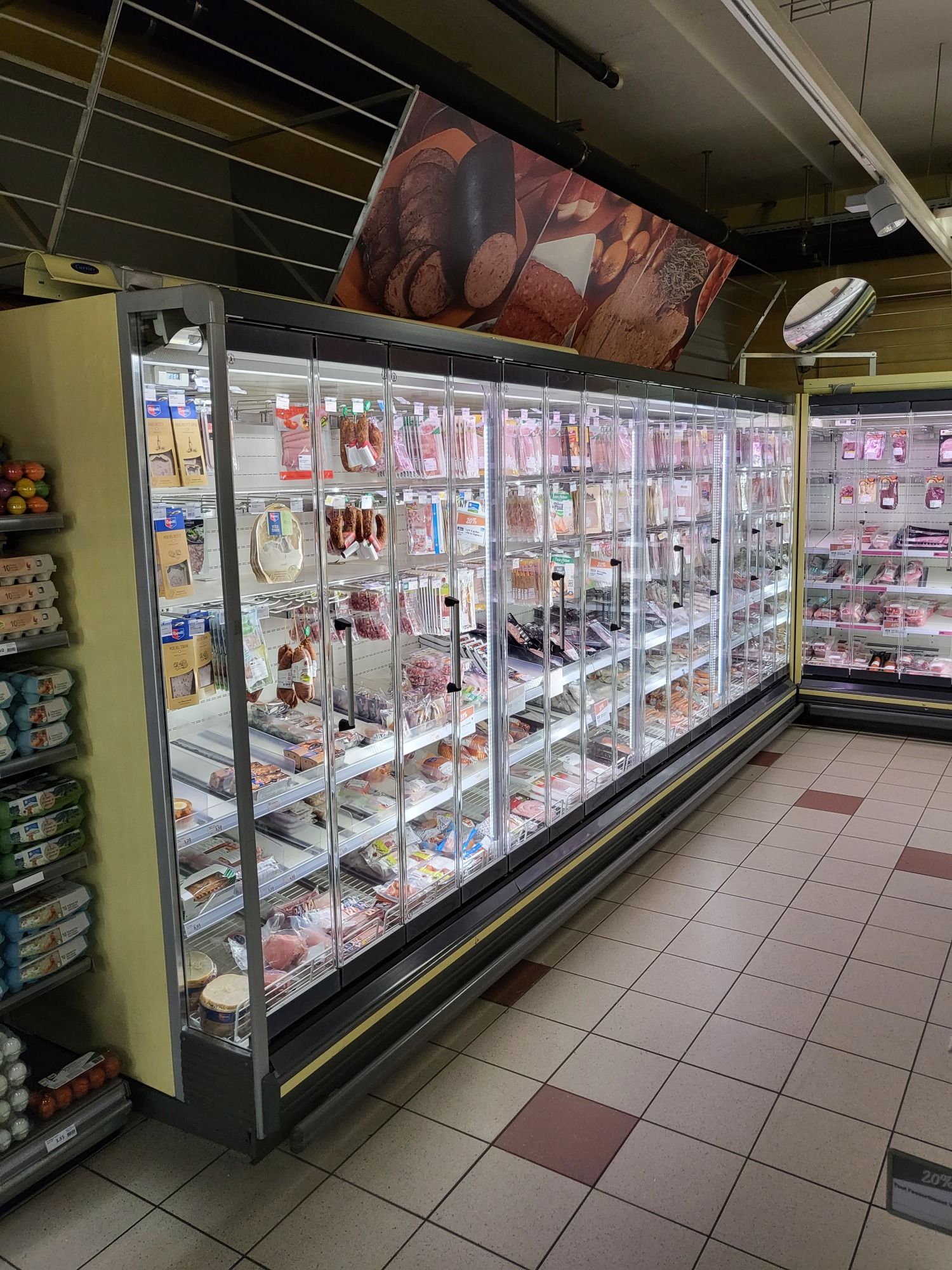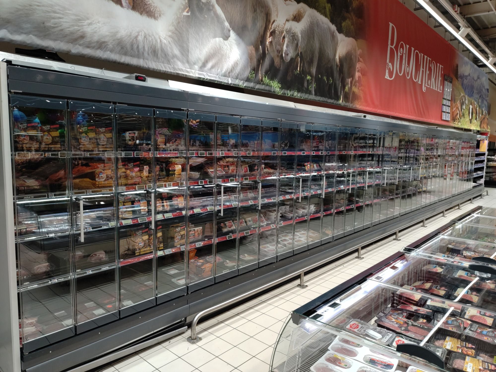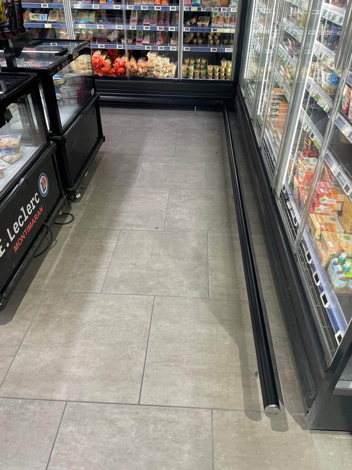 Rénovation de vitrines avec portes pliantes pour gagner de l’espace et faciliter le passage des chariots de grande surface. Installation de LED.