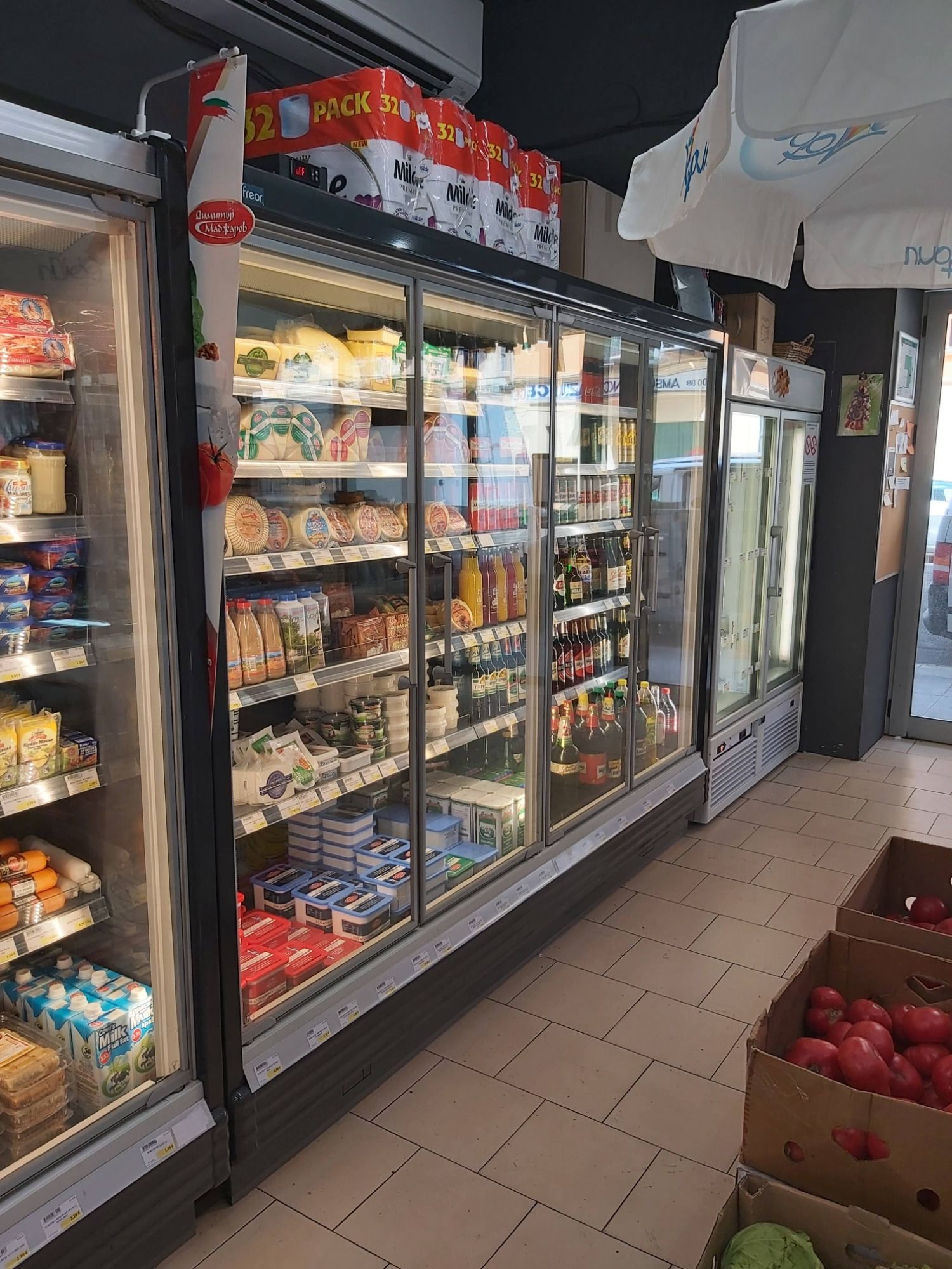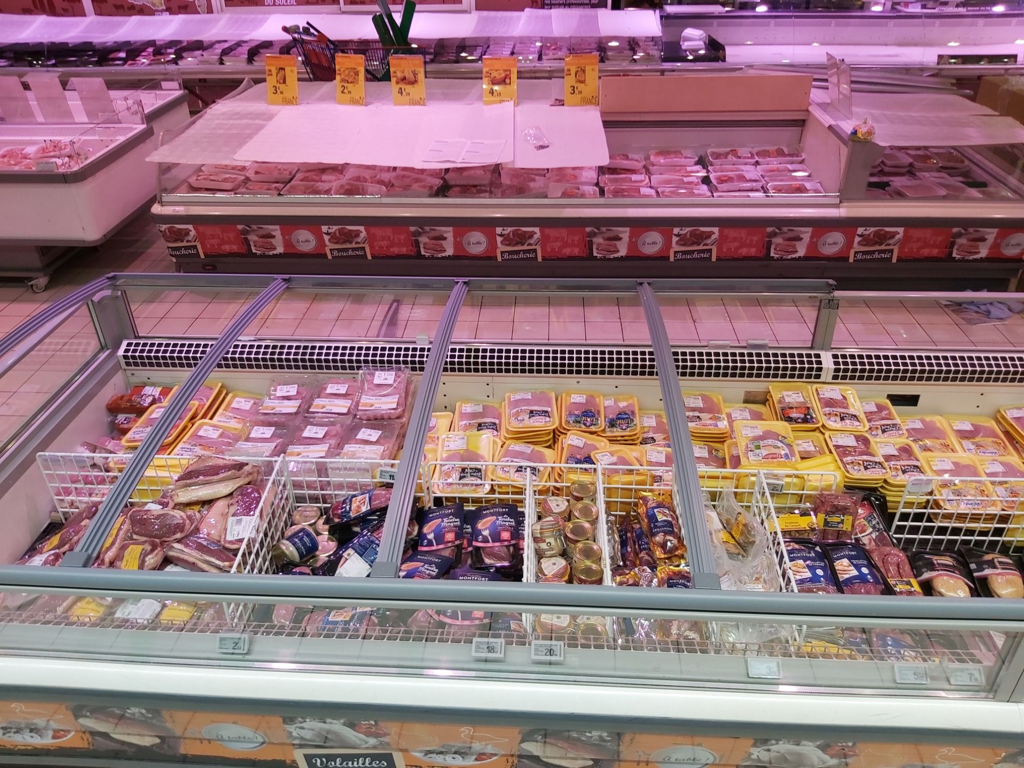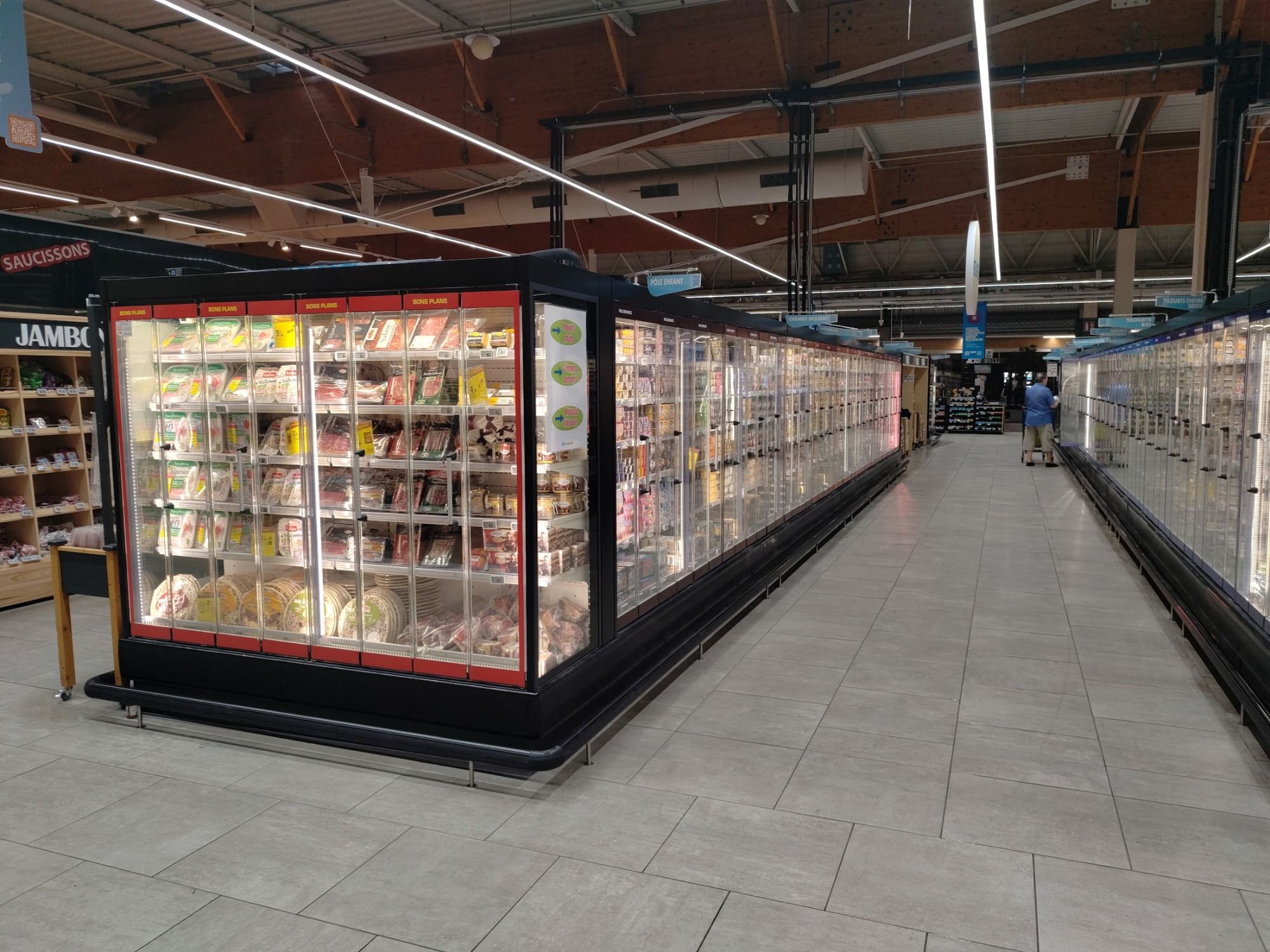 Rénovation de vitrines avec portes pliantes pour gagner de l’espace et faciliter le passage des chariots de grande surface. Installation de LED.